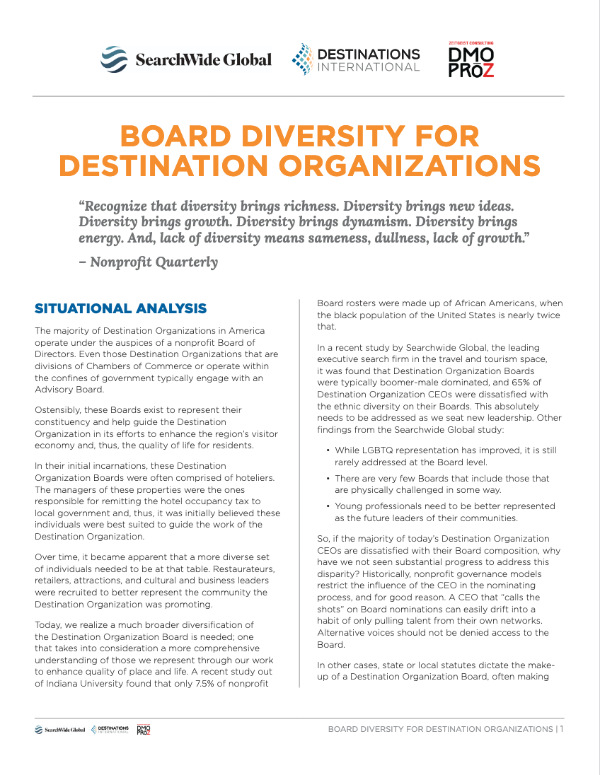 The majority of Destination Organizations in America operate under the auspices of a nonprofit Board of Directors. Even those Destination Organizations that are divisions of Chambers of Commerce or operate within the confines of government typically engage with an Advisory Board.